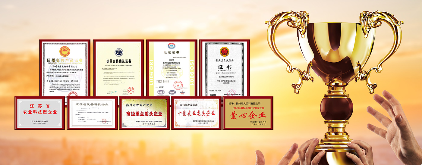 先后榮獲江蘇省飼料質量合格產(chǎn)品、江蘇省名牌產(chǎn)品、揚州市消費者滿意商品、揚州市質量計量信得過產(chǎn)品等稱號。